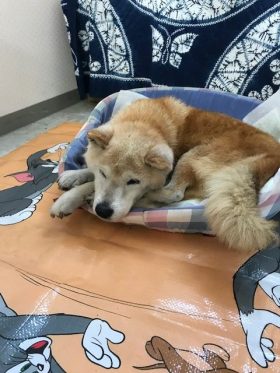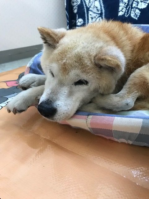 当店の看板犬のカイは老犬のためこの暑さで外は危険なので室内に避難中です!