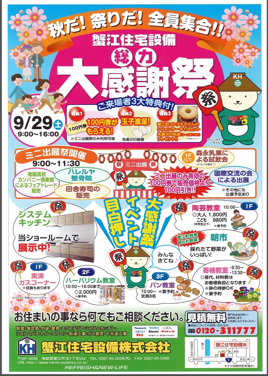 2018年9月29日(土)弊社にて、秋の大感謝祭を開催します。今回は大人気のハーバリウム教室、パン教室を行います。初心者の方でも丁寧にご指導いたしますので、ご興味のある方はこの機会に是非ご参加ください。その他イベント盛りだくさんです。皆様のご来場心よりお待ちしています。